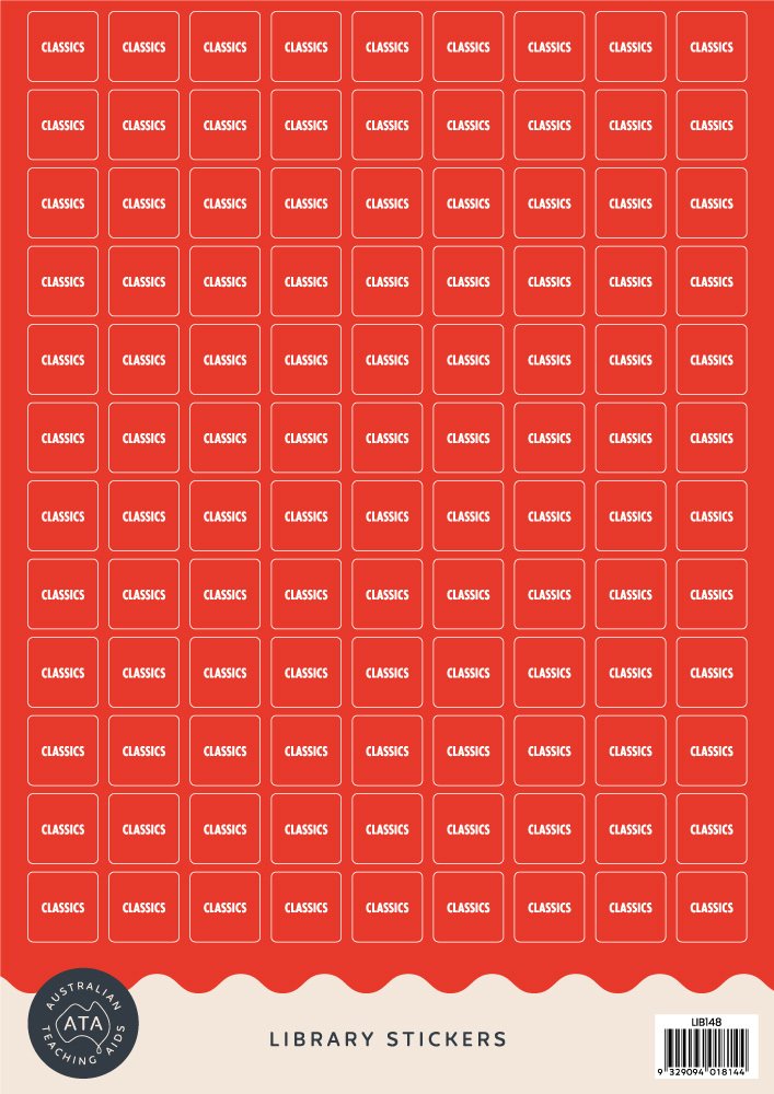 Each sticker is 19mm x 19mm, the perfect size for visibility on book spines without covering essential information. They feature a bold red background with the word 'CLASSICS' in white, designed to stand out on a shelf and guide patrons directly to works of enduring significance. Manufactured and printed in Australia, these stickers adhere to the highest quality standards.