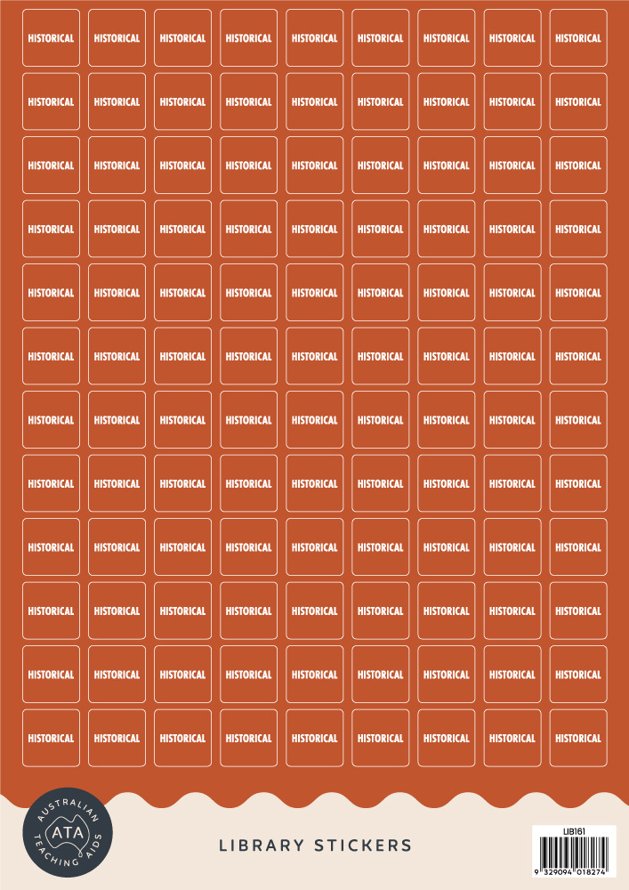 Sized at 19mm x 19mm, each sticker is large enough to be immediately noticeable on book spines. The deep rust hue is reminiscent of the rich tapestries of history, with 'HISTORICAL' clearly printed in white for easy identification. Designed and printed in Australia, the stickers are durable, made to last in even the most frequently browsed collections.